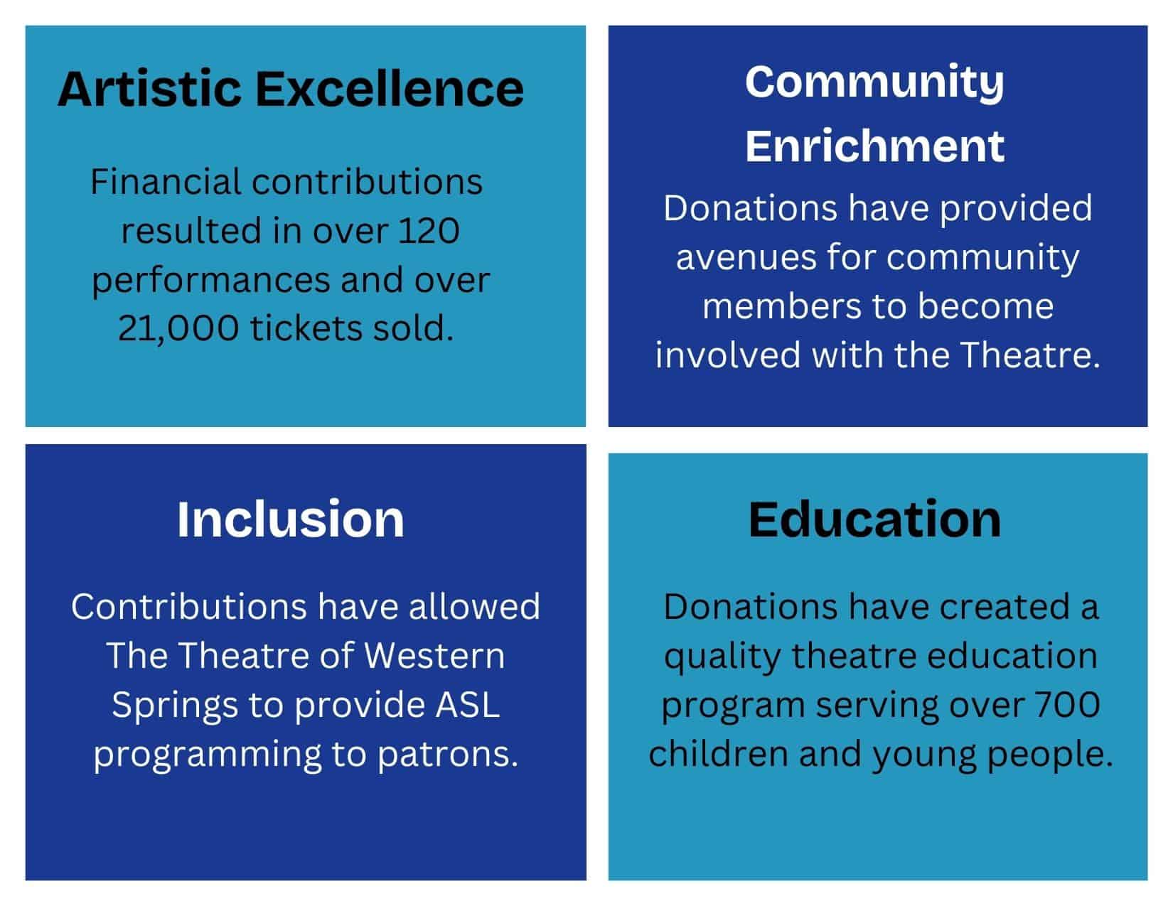 The mission of The Theatre of Western Springs is to entertain, to educate, to explore, and to inspire a community of all ages through the performing arts. The income generated from ticket sales is not enough to uphold the quality of programming that the Theatre of Western Springs presents. Donations are essential for us to keep supporting our mission.